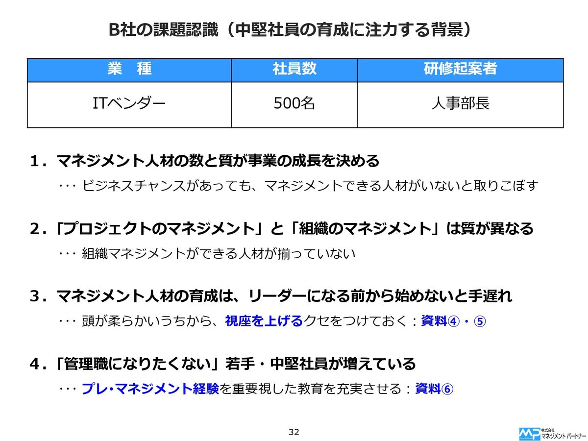 2つ目にB社さまですね。こちらは社員数500名のITベンダーです。かねてよりマネジメント人材の数、そして質、両面の不足を非常に課題に感じてたんですね。プロジェクトは回せても、組織をマネジメントできる人材が育っていない。そんな中で、リーダーになる前から視座を高める必要性があるなとお考えになられていました。