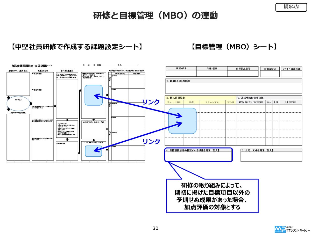 (スライドを示して)こちら、第2章で一部ご紹介をした自己革新課題という内容なんですが、自己革新課題を設定するためのシートなんですね。これはA社さまのMBOのシートなんですけれども、ここで出した課題の設定を、そのままチャレンジ項目に記入するというふうにリンクさせました。