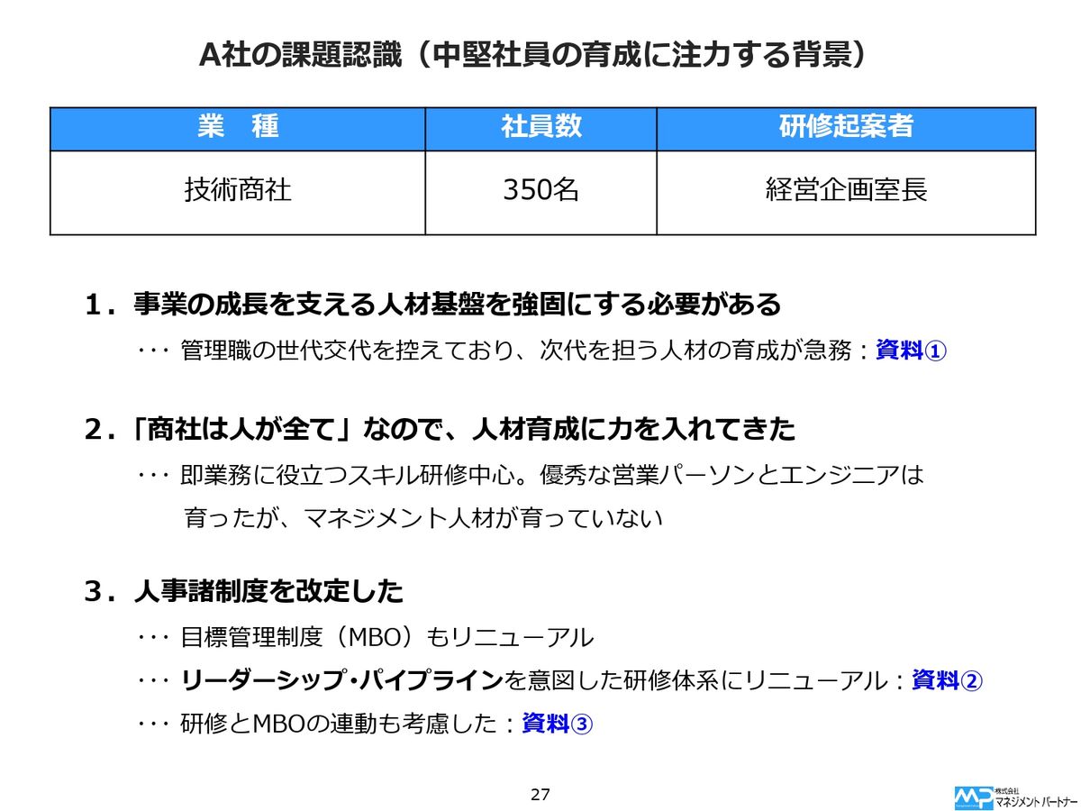 まず1社目です。技術商社のA社さまですね。中堅社員育成の背景として、管理職の世代交代が迫っていて、次代を担う人材の育成が急務でした。