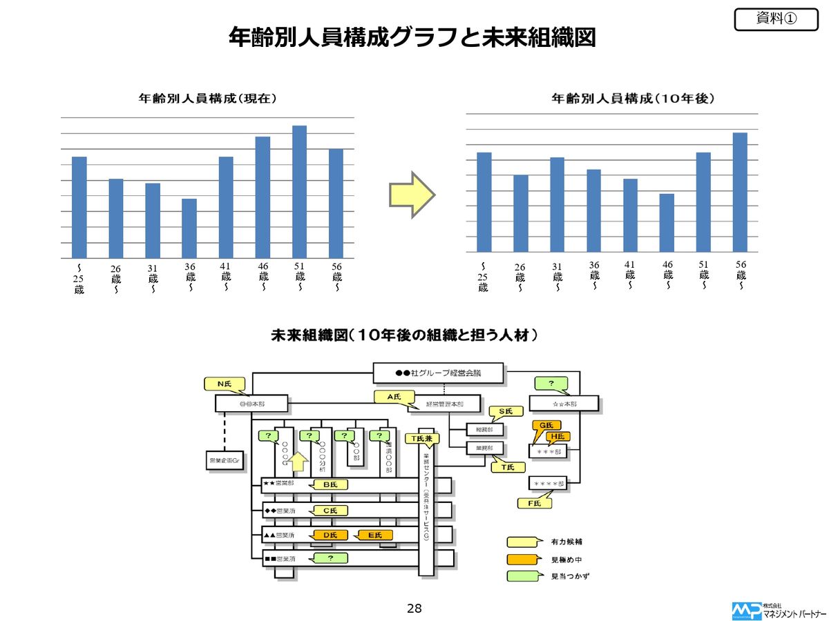 (スライドを示して)というのも、この左上これがA社さまの年齢別人員構成で、ご覧のとおり30代が少なく、50代が多い。