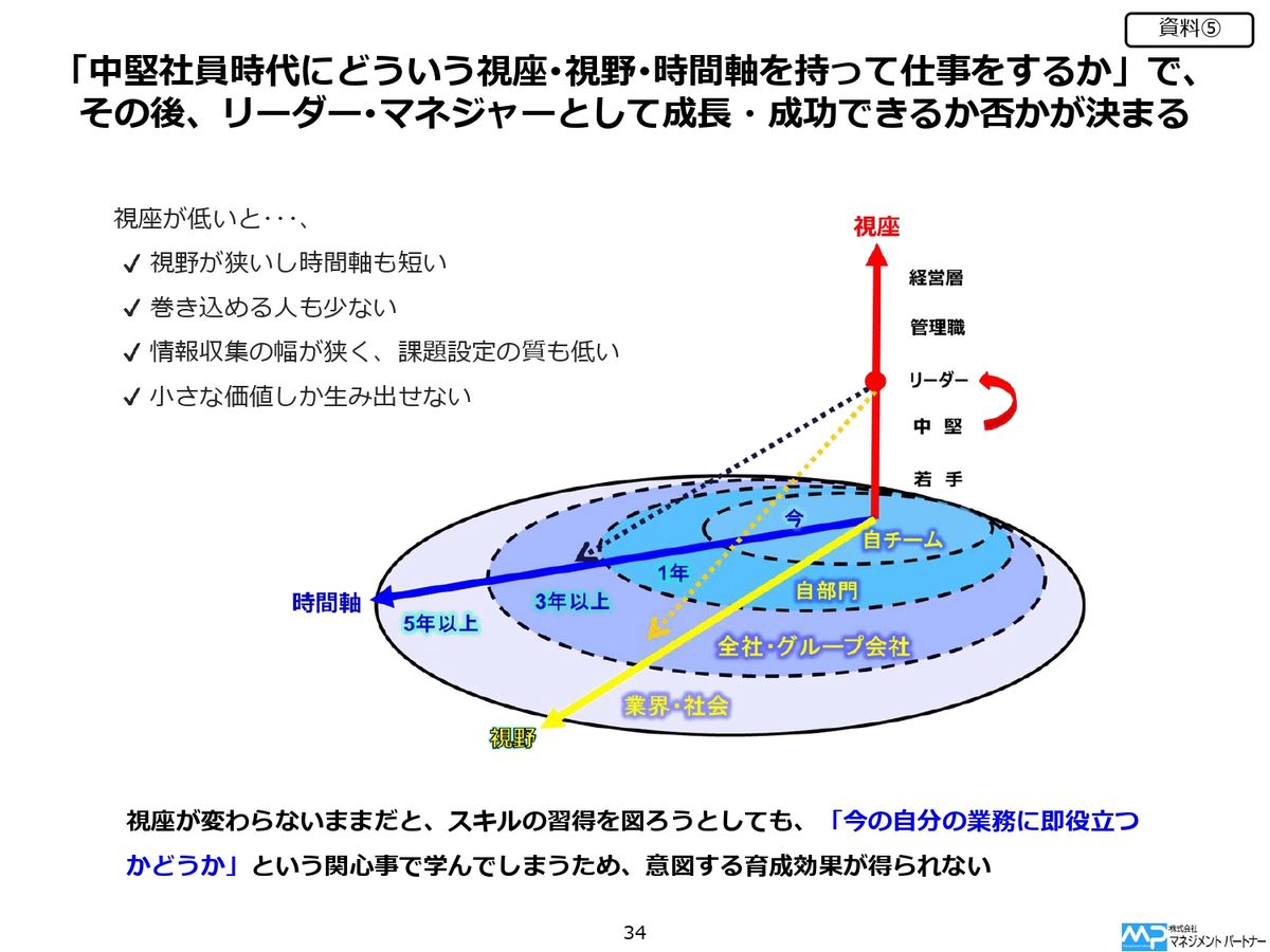 もしもそういった環境の中で「そうは言っても中堅なんだから、人を巻き込むコミュニケーション力を学びなさい。プレマネ(プレマネジメント)研修やって計画の立て方、リーダーシップを学びなさい」と、視座が上がっていない人に無理やりスキル習得を図ろうとするとどうなるかというと、今の自分の業務に役立つ部分だけつまむっていう、第1章でお伝えしたような個人主義的な軸足が変わらないんですよね。