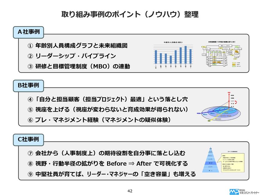 関教宏氏:ここからは今のポイントを踏まえて、私どもが実際に中堅社員の育成に関わらせていただいた事例を3つご紹介いたします。