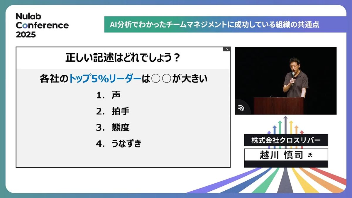 「じゃあ、なぜか?」ということで調べました。トップ5パーセントのリーダーは、うなずきが4.5センチから6センチ深い。みなさん、これを調べた我々がすごくないですか。うなずきを調べるんですよ。815社の社内会議を3万2,000時間録画していますので、調べられるんですよ。