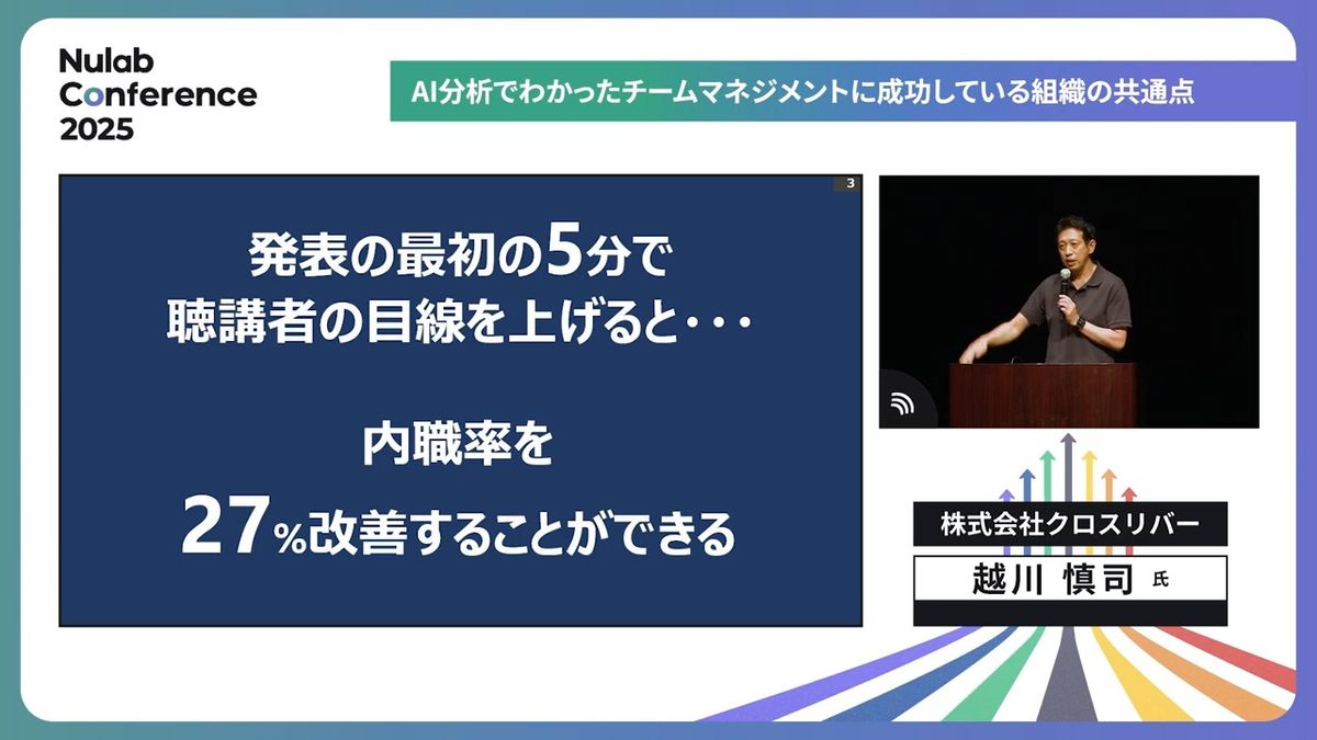 だから、最初の5分間で目線を上げさせる。そうするとしっかりと聴いてくれるという。だから、みなさんが行動を変えないといけないんですよ。というエビデンスドリブンでご紹介します。
