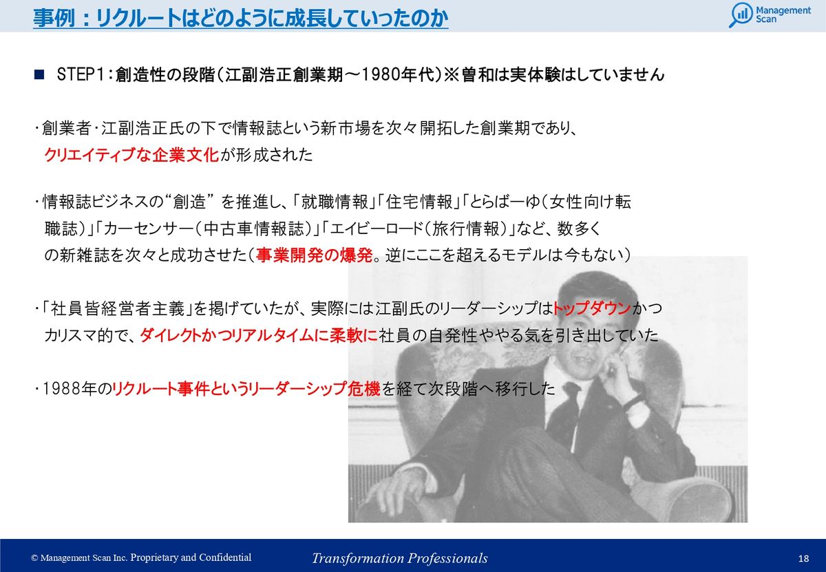 曽和:それまでのことを以前から在籍していた古参社員の人から聞いたところでいうと、江副浩正さんという天才経営者が、江副モデルと呼ばれるような、今のマッチングプラットフォームみたいなことを次々と開拓した創業期であり、クリエイティブな企業文化が形成された時期だなと思います。