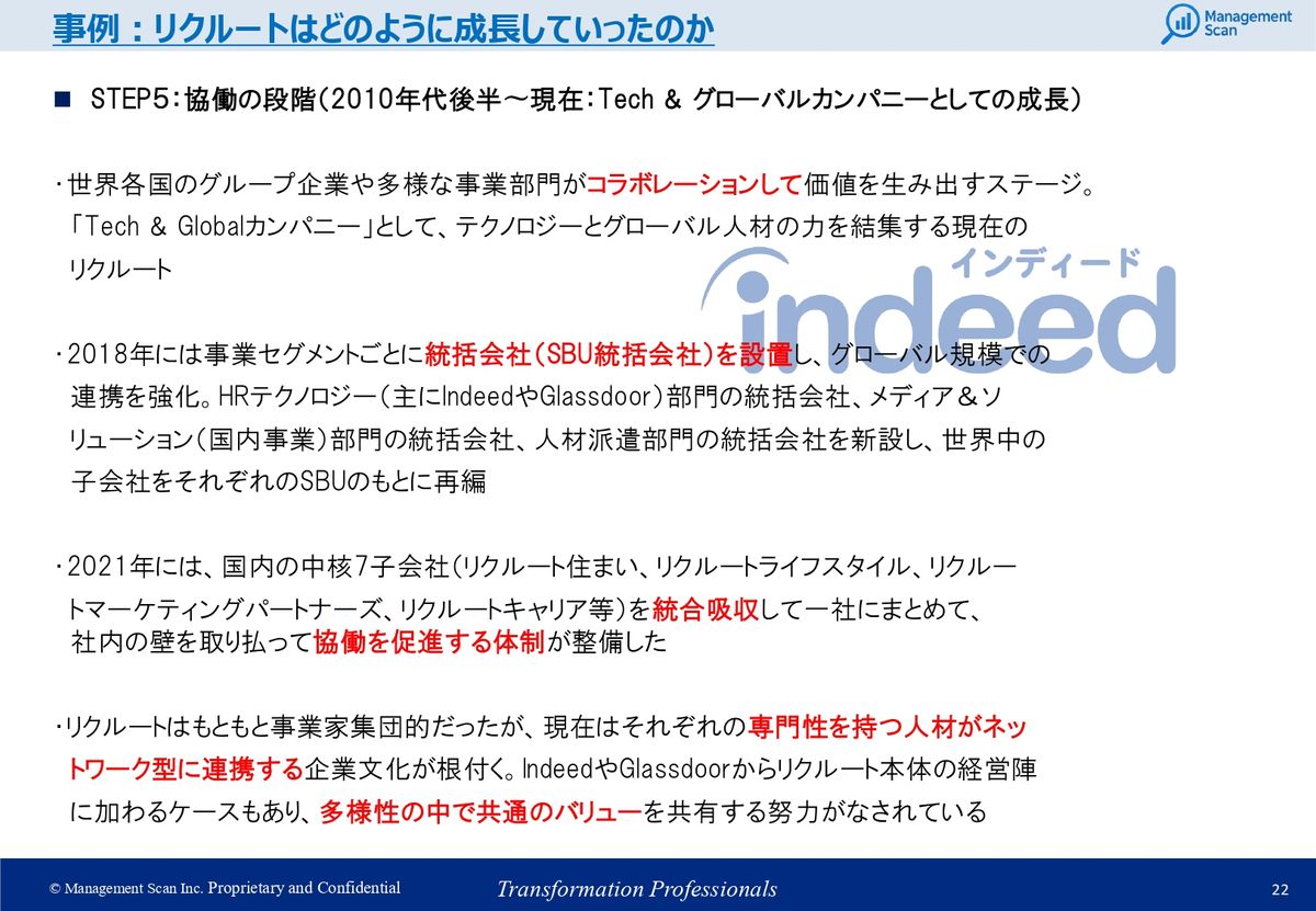 今はもう本当に多様な専門性を持った人材が生まれて、そうした人材がそれぞれチームを組みながら価値を出していっているのかなと思います。その象徴的なものが、Indeedとかそういったところ。もうIndeedの創業者の方とかも、今はリクルートの本体の役員になっていたりしますよね。