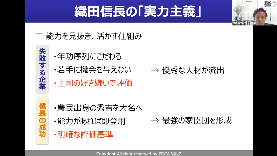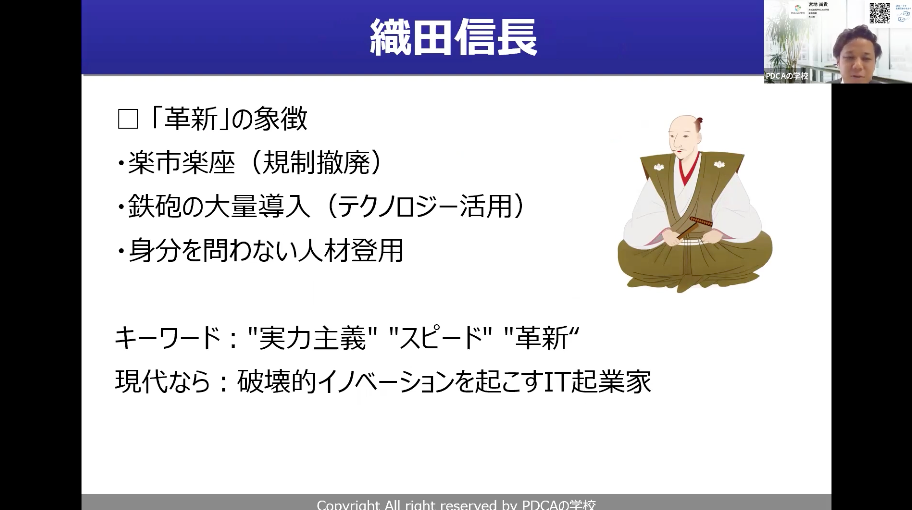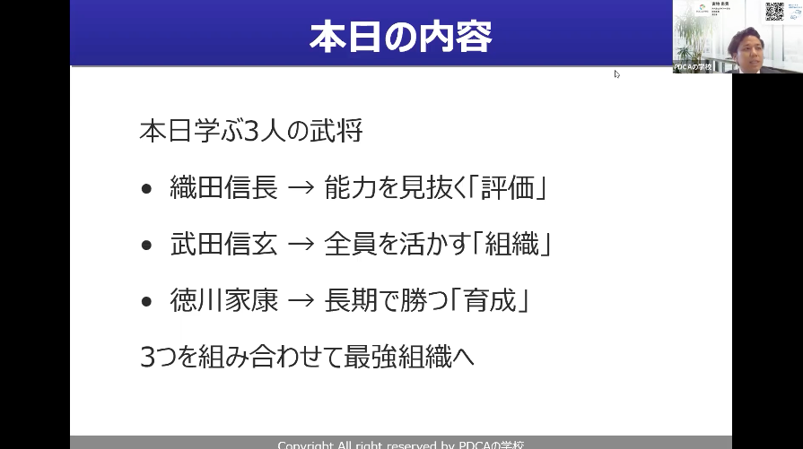 ではあらためて、今回は「戦国武将から学ぶ 限られた戦力で勝ち続ける人材育成の極意」ということで、織田信長から学ぶ評価制度と、武田信玄から学ぶ組織作りと、徳川家康から学ぶ育成の分野をお伝えできればなと思っております。