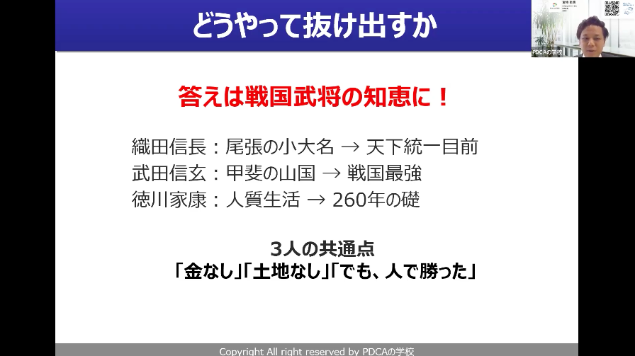 ですので、中小企業だからこそできる教育の体制を戦国武将から学んでいこうと。織田信長、武田信玄、徳川家康も、最初は領地が少ないところから天下統一の目前までいったり、人質生活から(始まって)、何年も名前が引き継がれるような、誰もが知っている状態になっている。