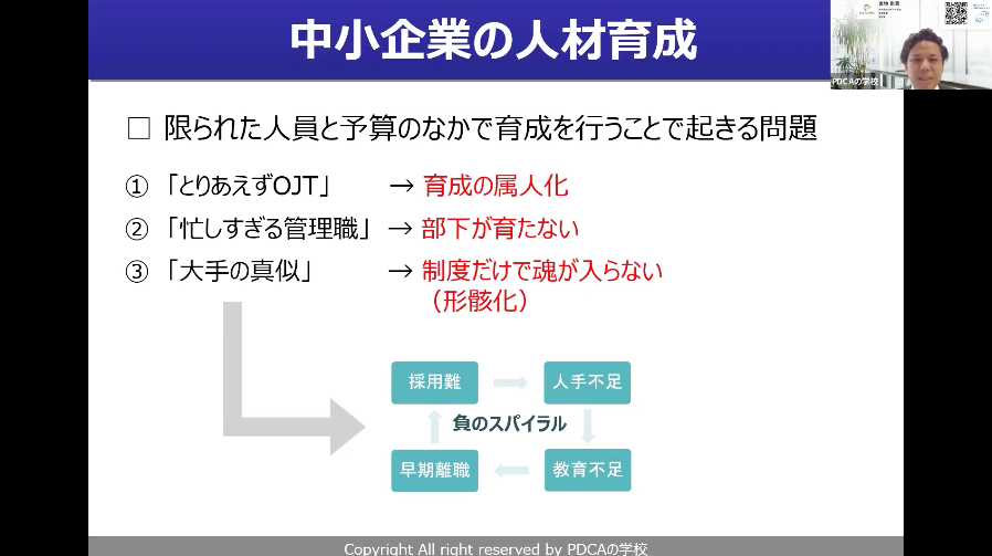 なので中小企業の人材育成でいうと、とりあえずOJT(On-the-Job Training)とか、入社後の育成フローみたいなところがなかなか固まっていないケースが多いのかなと思います。「とりあえず先輩につけておこう」とか、「育成か~。そんな時間、ないなあ」「自分でやったほうが早い」というので、管理職の方がいつまでもプレイヤーから脱却できないとか。