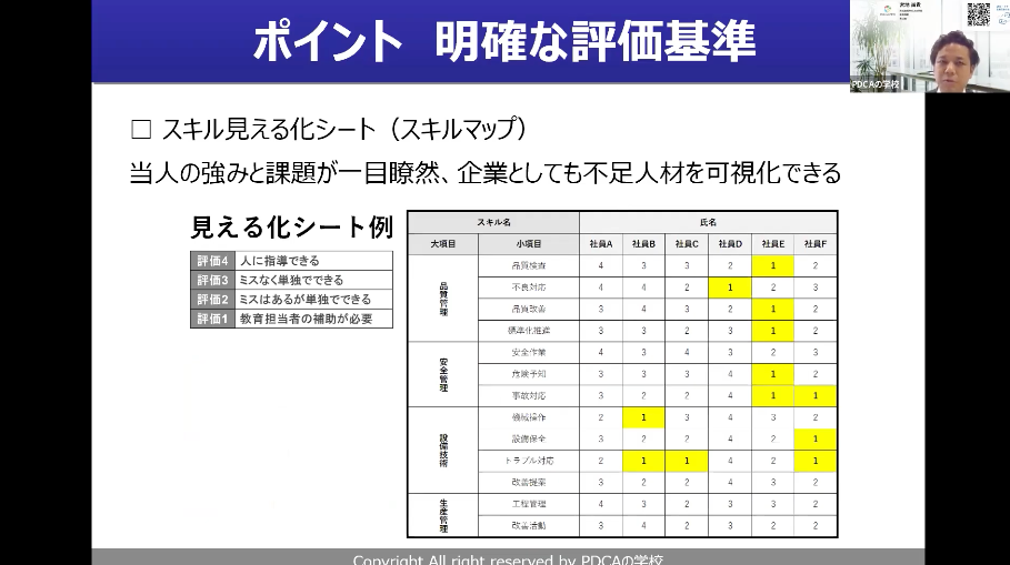 もしかしたら項目によっては教える必要がない、教えるシーンがないところもあると思うので。ここで今、一例として出させていただいておりますが、評価基準はスキルマップみたいなところ……厳密に言うと、やっぱり項目によって評価基準を変えないといけないのかなと思っております。