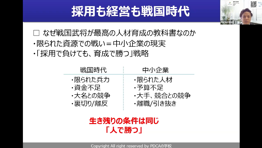 初めて戦国武将との掛け合わせのセミナーをやらせていただく中で、なぜ取り上げさせていただいたのかをあらためて言いますと、(スライドを示して)こちらですね。意外に、(経営と)通ずる部分が多くあるなと思っています。限られた資源の中で戦わないといけない。待っていれば人が集まる状態でもない。いろいろな分野でのリソースも限られています。要は、十分な人材が集まらないというところ。