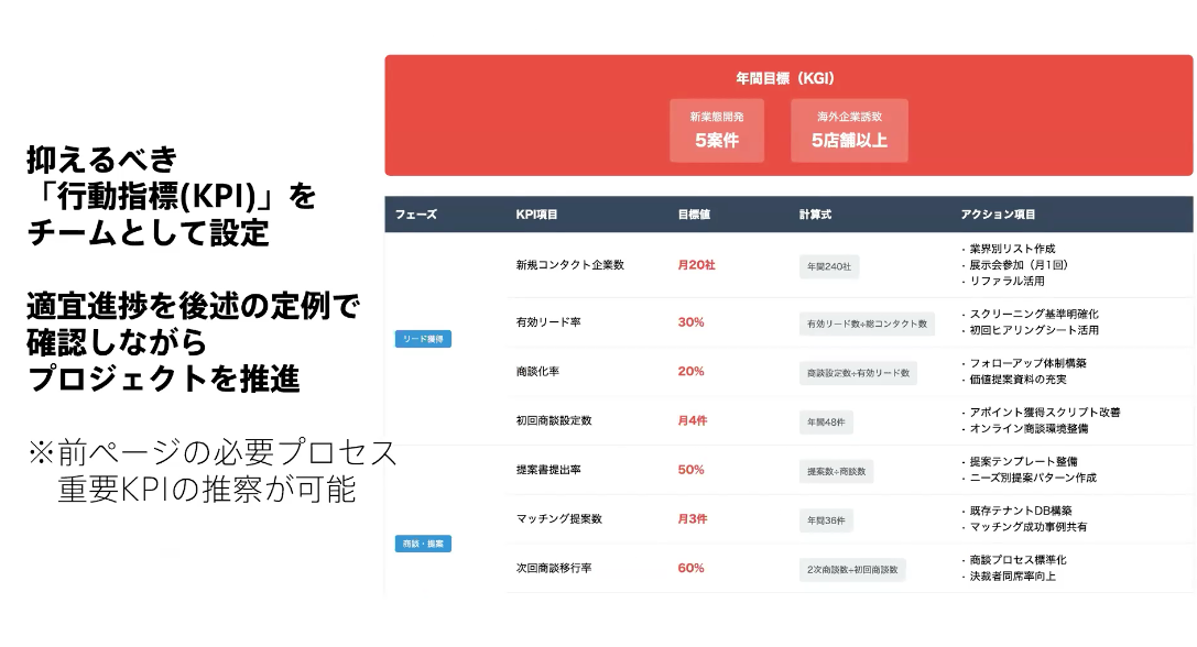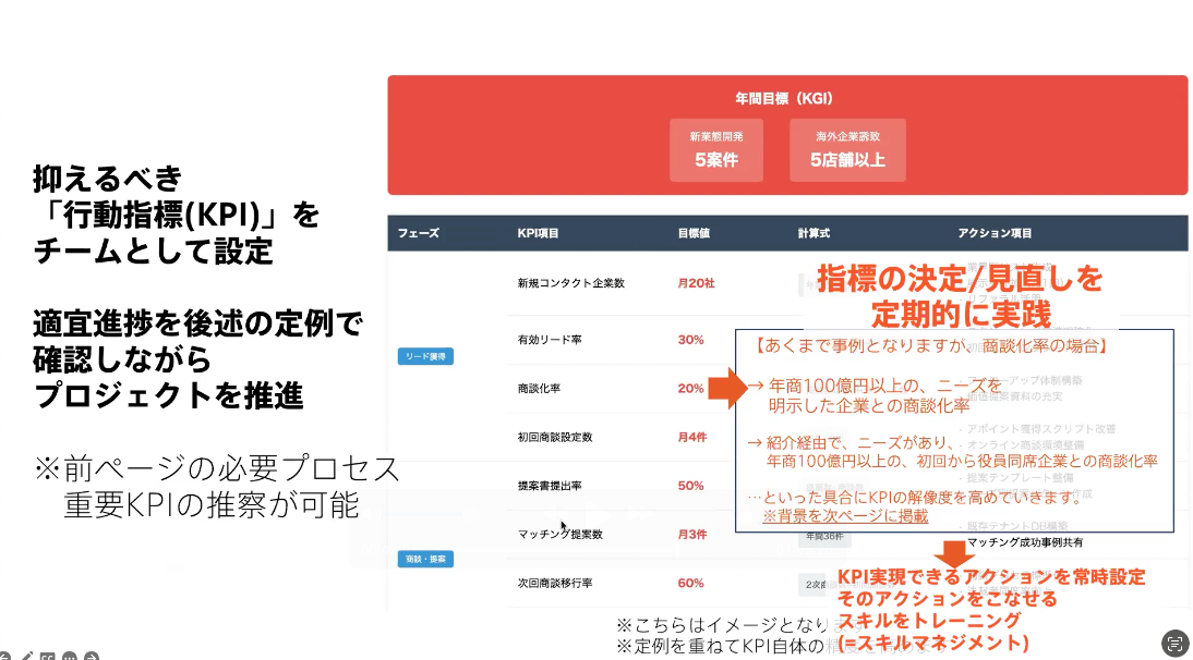 もう1つはKPI、まさに行動目標自体の解像度の話になります。ちょっと字が多くて恐縮なんですけども、例えば(スライドを示して)この左側のKPI項目として、「新規コンタクト企業数」とか「有効リード率」とかをいろいろと書いておりますが、ここの解像度を上げるのもすごくポイントです。