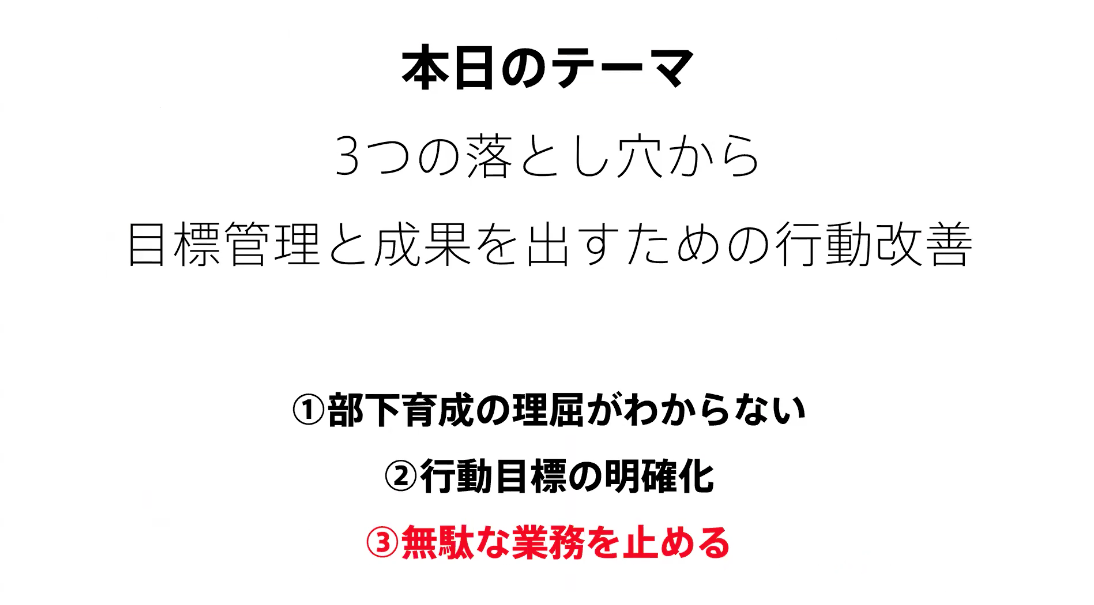 最後に、私のテーマである「3つの落とし穴」の3つ目になるんですけども、「無駄な業務をやめる」というところについてお話しできればと思います。