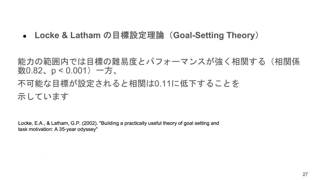 要は、目標を立てたことによってメンバーのパフォーマンスが明らかに良くなるような、しきい値みたいなものです。(適切な)目標の条件については答えが出ています。