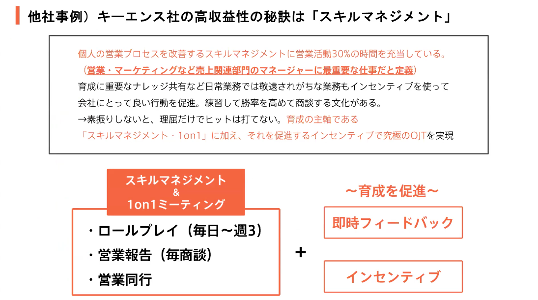 キーエンスさんだと職種ごとに108個の必要なスキルがございます。まさにこの仕組みで、マネージャーに頼らず会社として定義をしていくところが秘訣だと言われています。