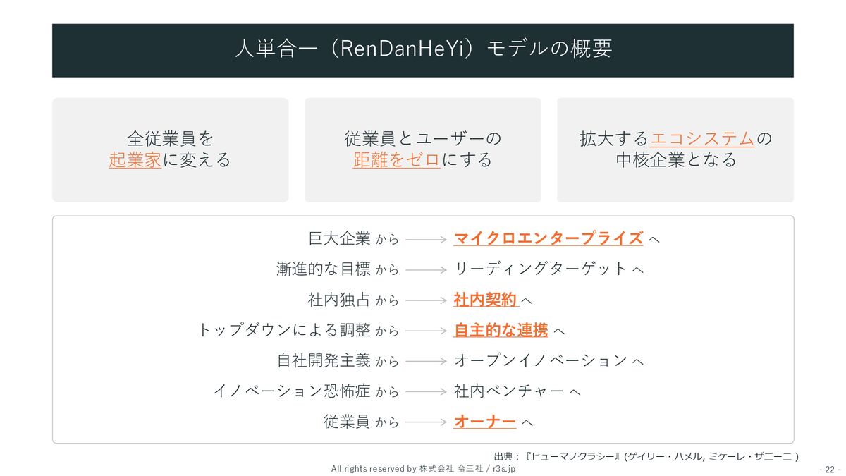 とにかく冒頭で人単合一と言った、従業員とユーザーのバリューを一緒にして、距離をゼロにして、一人ひとりの従業員が起業家として小さな企業のメンバーとして顧客に価値を届けるっていうこと。これをひたすらやるように組織全部を作り替えました。これが、すごく平たく言うとマイクロエンタープライズおよび人単合一の今のモデルです。