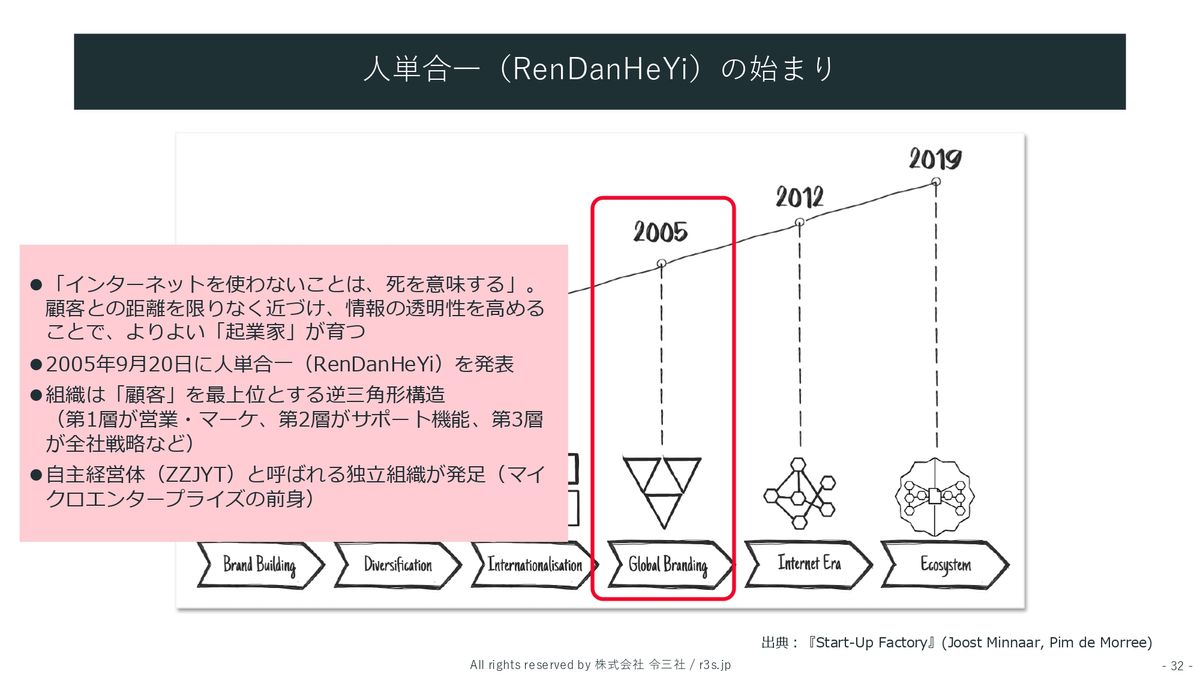 山田:ここから今の人単合一、RenDanHeYiにつながる話が始まるんですが、ちょうど2005年ってインターネットが始まった時代。それまで家電メーカーで「品質とブランドが大事だ」って言ってきたところから、「インターネット企業にならねばならぬ」っていうふうに変わったのがこの頃でした。