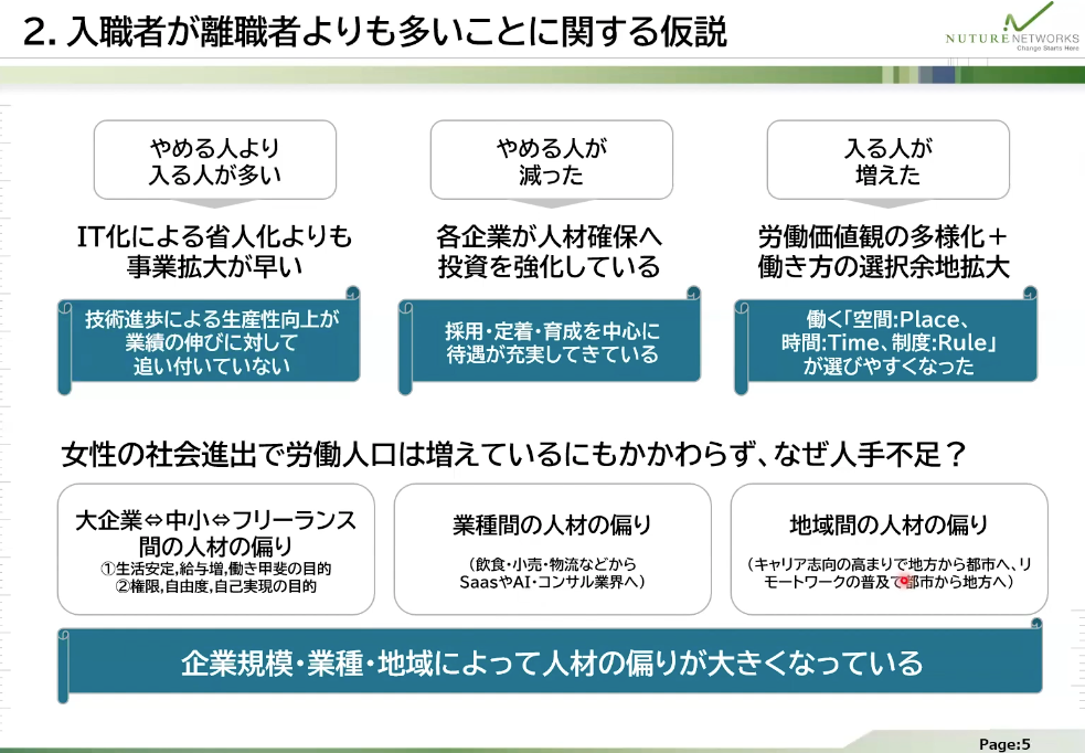 人手不足の声がずっと大きく言われ続けているのは、先ほどの3つの仮説に加えて、人材の偏りが起きているんじゃないかと思います。1つめが大企業、中小企業、フリーランス間の人材の偏りですね。2つめが、やはり業種間での人材の偏り。そしてさらに3つめが地域間の偏りになります。