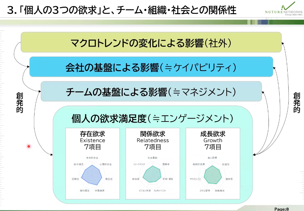 それぞれの欲求は段階的に積み上がっていくものでもなく、相互に影響を及ぼしています。1つめの存在欲求ですね。これは会社に行きたくなる環境と言い換えることができます。心身の安全性や職場の衛生環境、休養が確保できる、給与に満足しているなどですね。弊社では7項目で設定しています。