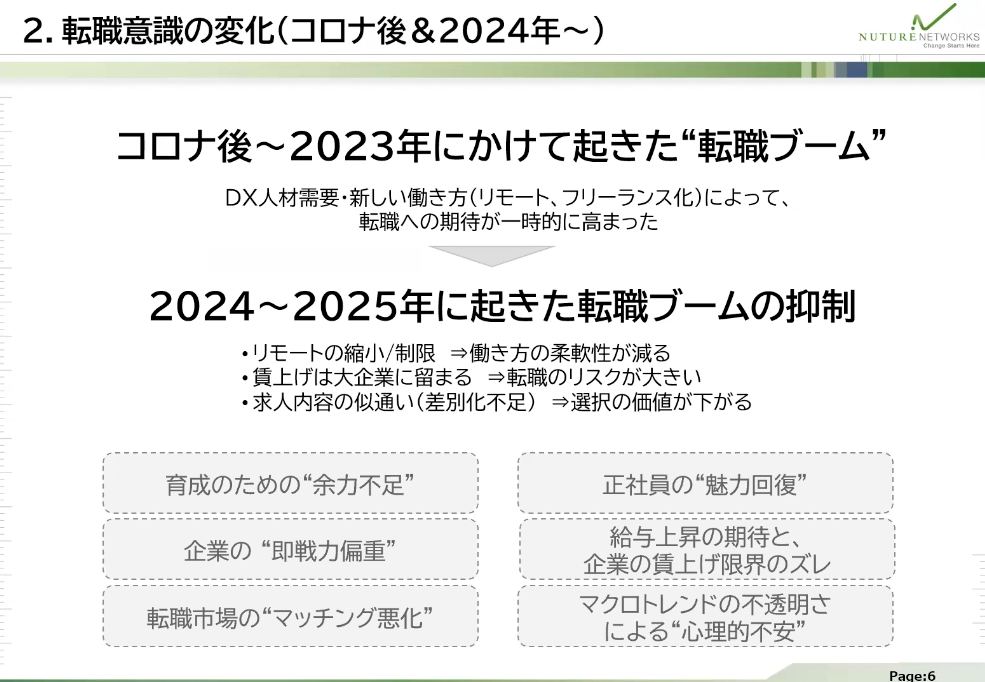 張:転職意識の変化についてはざっくりですけれども、コロナ後の3年間の転職ブームがあって、2024年からのブームの抑制というトレンドがあるかと思います。