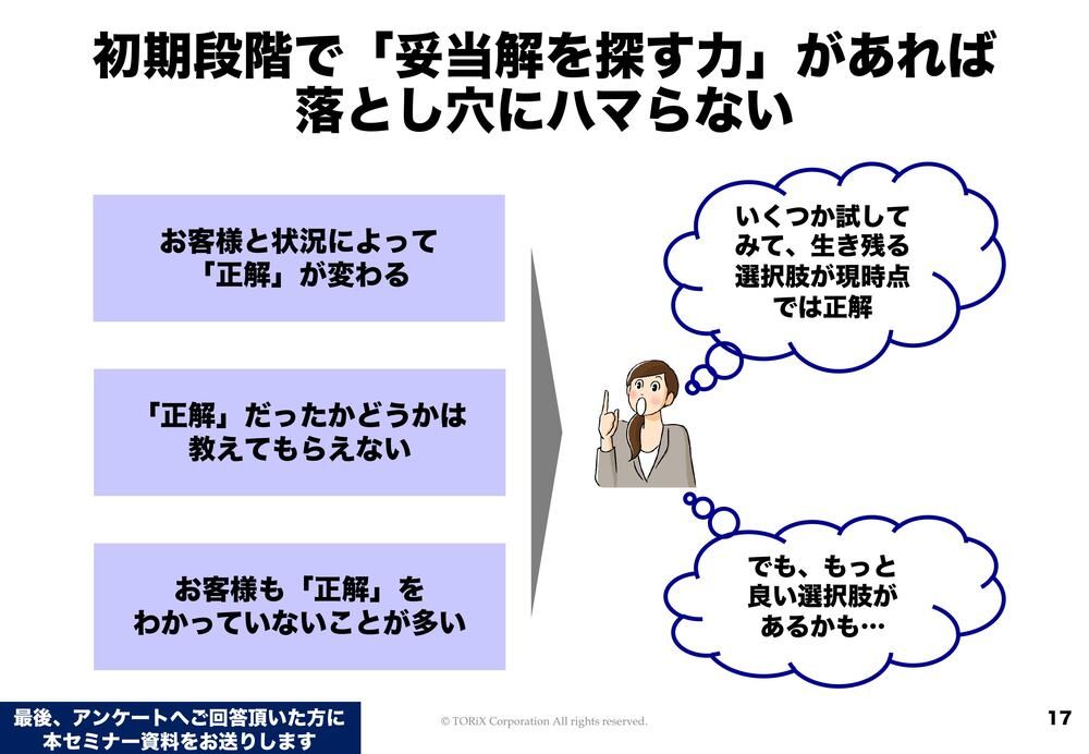 「傾聴」「熱意」「ストレート」と、どれもなんだか同じことは言っていないわけですよね。そうすると混乱してしまいます。妥当な解を探す力がないと、初期段階で簡単に行き詰まってしまう。これが、多くの営業の若手が直面している壁になります。