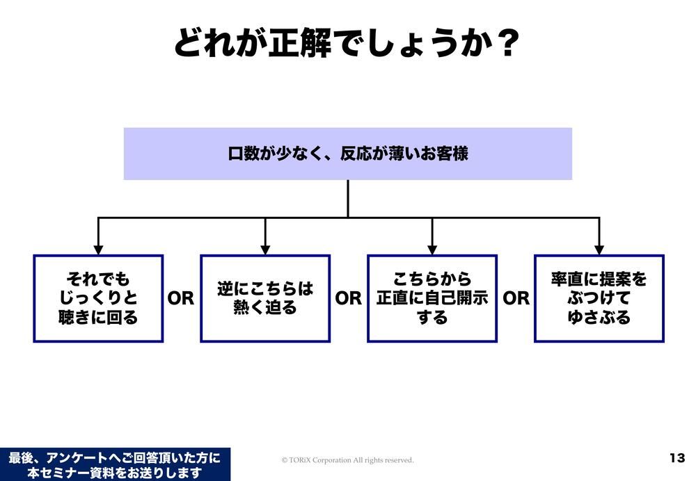 そんなお客さまがいらっしゃった時に、じっくりと聞き手に回るやり方もあれば、逆に熱く迫るやり方もあるし、こちらから正直に自己開示をするやり方もあります。さらには、率直に提案をぶつけて揺さぶるというアプローチもあり得るかもしれません。要するに、正解がパッとはわからないんだったら、複数の選択肢があり得るということです。