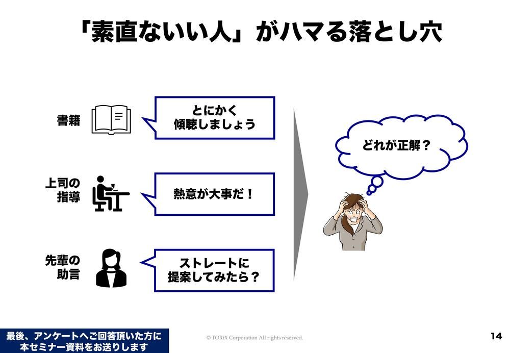 そこで、素直ないい人がはまりやすい落とし穴があります。例えば「本にこんなことが書いてある」「上司がこういう指導をしてきた」「先輩がこんなアドバイスをしてきた」という、この3つでそれぞれ違うことを言っていたらどうでしょうか?