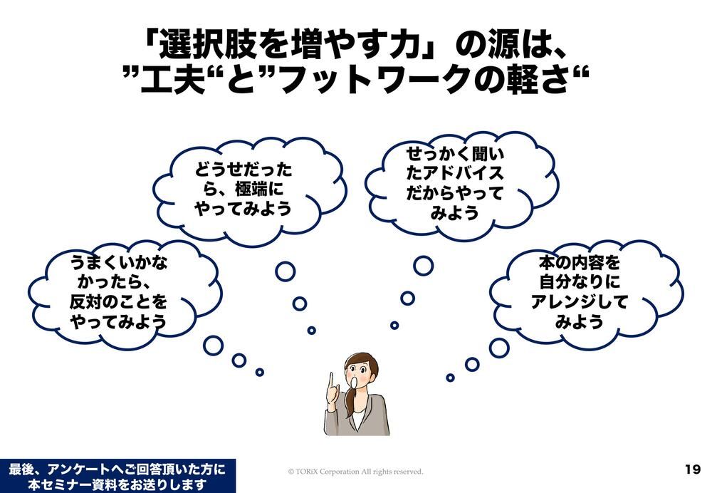 選択肢を増やすことにおいては、工夫とフットワークの軽さが必要です。「うまくいかなかったら反対のことをやってみよう」「どうせだったら極端にやってみよう」「せっかく聞いたアドバイスだからやってみよう」「本の内容を自分なりにアレンジしてみよう」とか、こういう方は伸びるのが早いです。