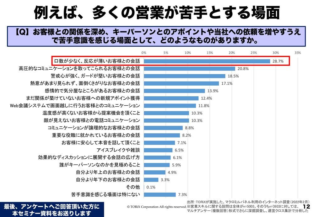 例えば、多くの営業の方は口数が少なくて反応が薄いお客さまって苦手だと思うんです。私も、苦手か苦手じゃないかで言えば苦手です。こういうお客さまはみんな苦手ですよね。「みんな」と言ってくくってしまうと語弊がありますが、苦手だという回答が一番多く集まっているのがこういうタイプのお客さまです。