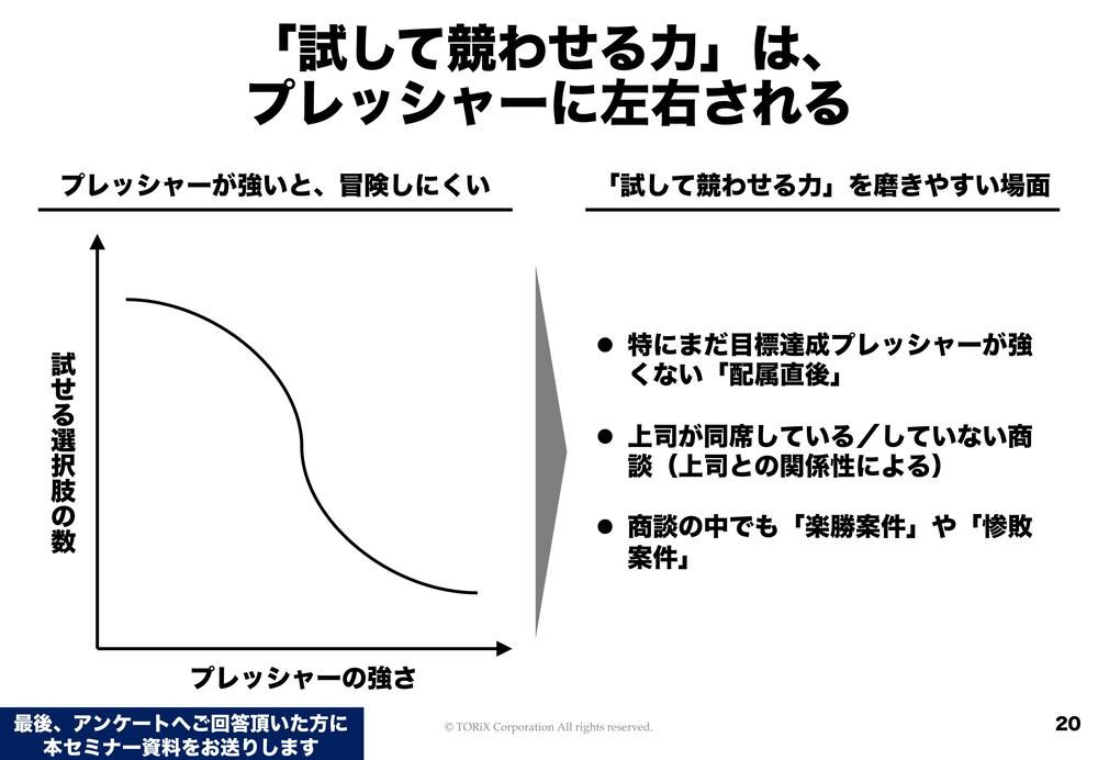 ということで、試して競わせる力は磨きやすい特定の場面があります。目標達成プレッシャーが強くないような配属直後だったり、あるいは上司が同席している商談。関係性によっては、上司が同席していないほうが試しやすいというのはあるかもしれませんね。あとは、商談の中でも楽勝案件とか惨敗案件のようなものです。