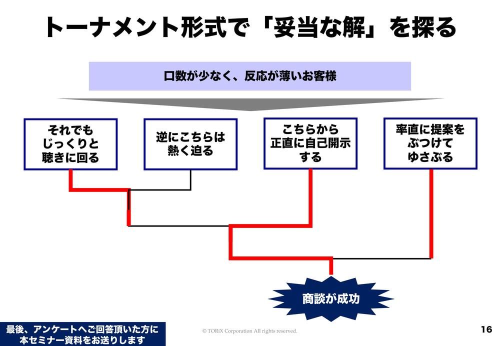 だったら何の型が必要なのかというと、妥当な解を探す力について、最低限現場で通用する基準まで引き上げていかなくちゃいけないんです。これはどういうことかというと、トーナメント形式で妥当な解を探ることができるということです。