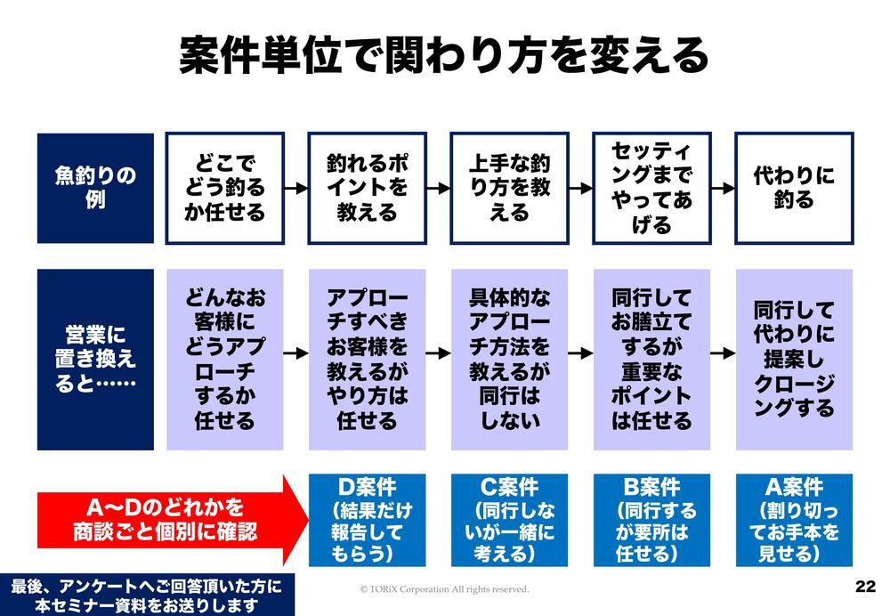 ここでのポイントは、人によってレベル感を変えるだけだと、きめ細かさが足りないんじゃないかということです。「この案件はけっこう深く関わるよ」「この案件は触りだけ」とか、案件単位で変えていきます。