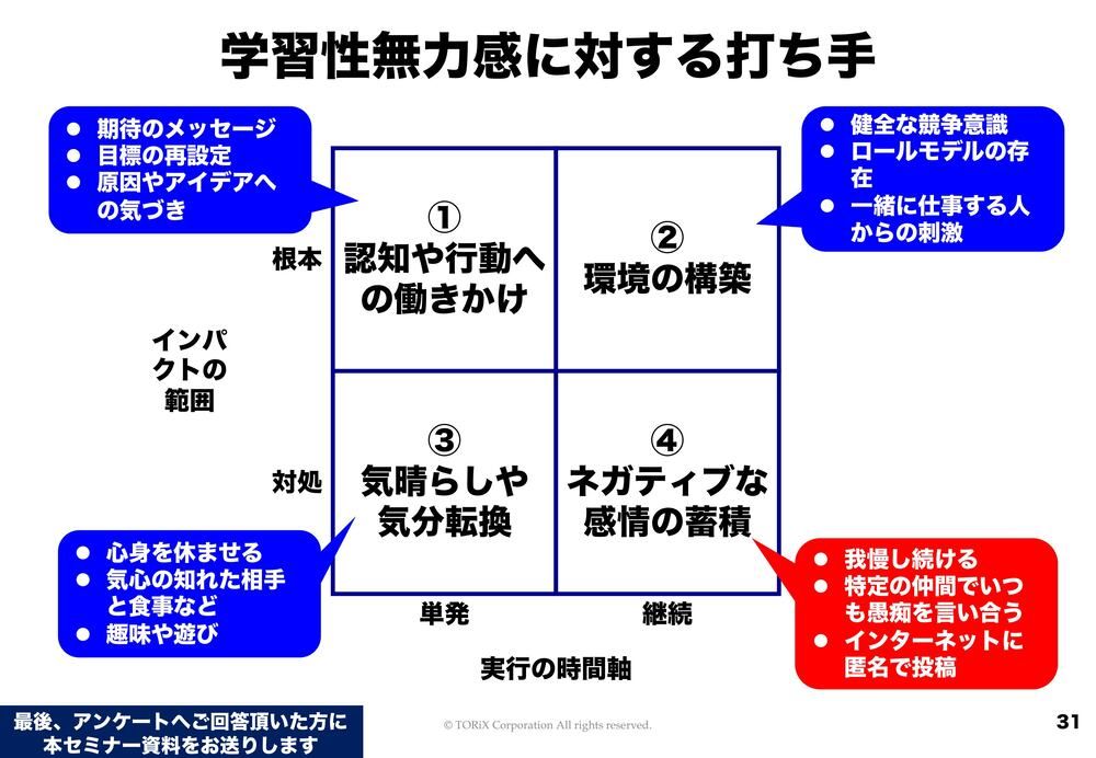 どうやって学習性無力感を避けていったらいいのか? ということで、4つほど挙げさせていただきたいと思います。縦軸が、インパクトの範囲として根本なのか対処なのか。横軸が、実行の時間軸として単発なのか継続なのかというものです。