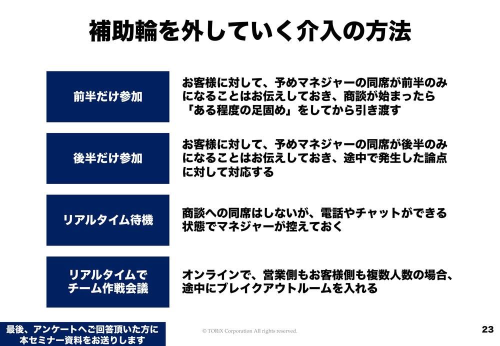 さらには「リアルタイム待機」といって、(商談に)同席はしないんだけれども、電話やチャットができる状態でマネージャーが控えておくというのもあります。あとは「リアルタイムでチーム作戦会議」です。複数人数対複数人数の商談で私はよくやるんですが、途中でブレイクアウトルームを作って、こちら側もお客さま側も作戦会議をします。