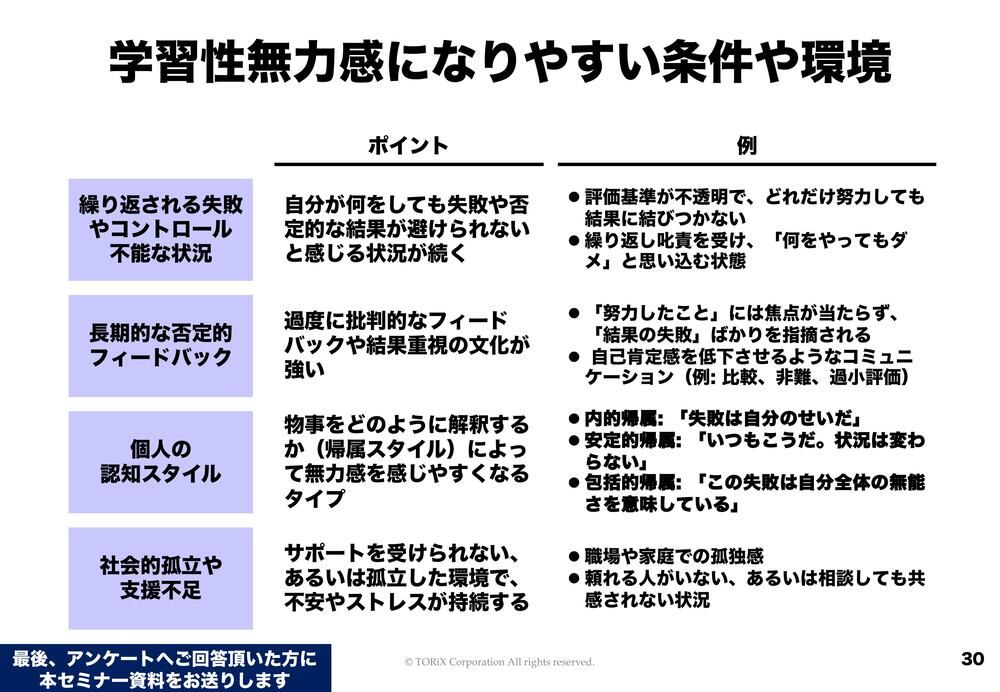実は、学習性無力感になりやすい条件や環境があります。それは、「もういくらやってもダメだ」と思ってしまうような繰り返される失敗や、コントロール不能な状況です。よくモチベーションの問題で言われるのが、長時間労働よりも、裁量とかコントロール可能な変数が狭められているほうが深刻であるということです。