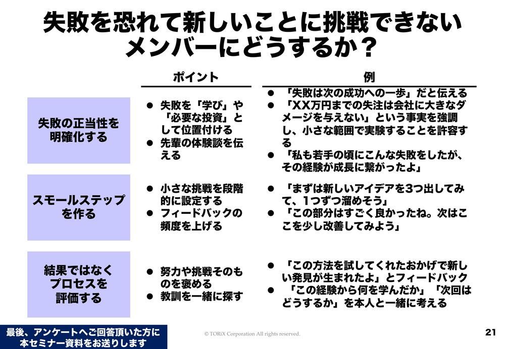 いくつかポイントを挙げていきます。まず1つが、失敗の正当性を明確化することですね。一概に「失敗」とか「成功」というラベルを貼ること自体もどうかというのはありますが、やはりメンバーとしては、失敗という受け取り方をしてしまう方ってどうしてもいらっしゃいますよね。