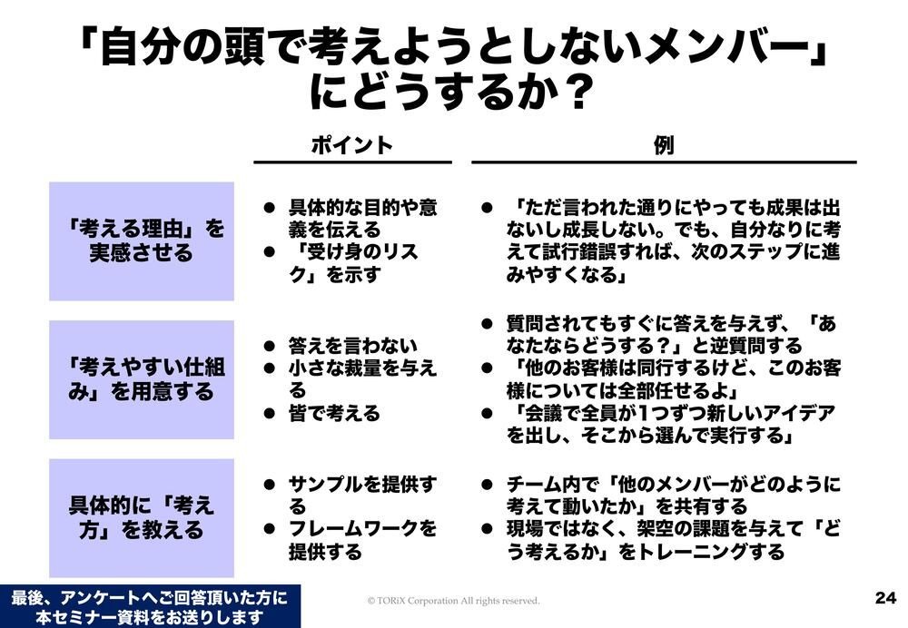 考えようとしない人に対しては、まずは考える理由を実感させる。それは、考えることにどんな意味があるのかを教えてあげることもありますし、考えやすい仕組みを用意する。よく言われるのが、「マネージャーがすぐに答えを言わない」とか「全部を依存させない」ということです。