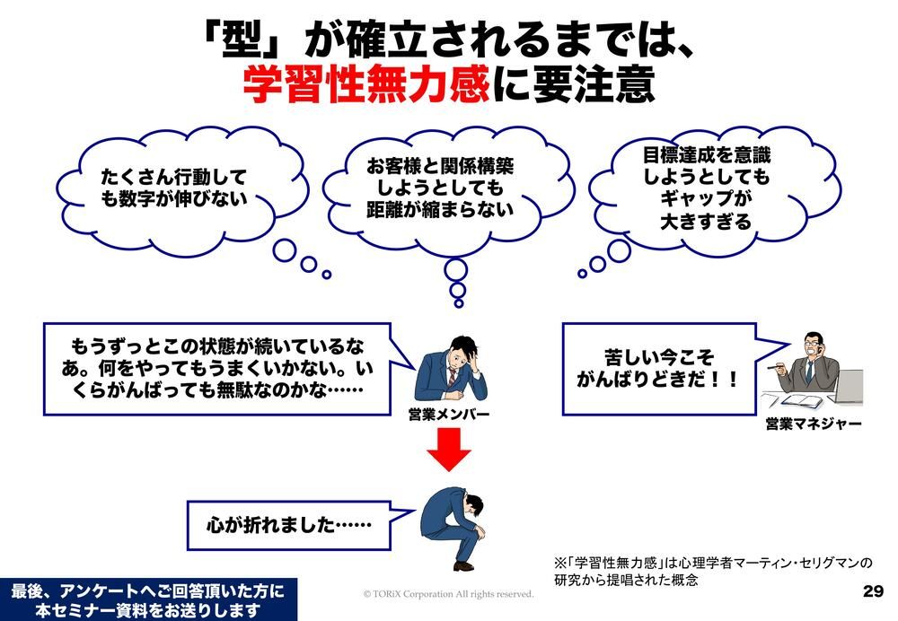 ですので、マネージャーが対策を立てるべきは心が折れないようにすることです。心が折れる状態を心理学の用語では「学習性無力感」というふうに言います。無力感を学習してしまっているということですよね。