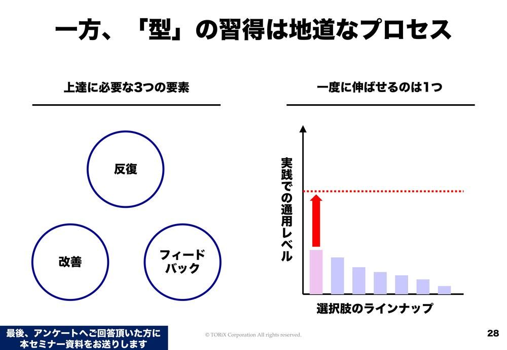 次に考えるべきなのは、ある程度は型ができてきても、それができないリスクがあります。まず、型の習得ってすごく地道なんですよね。反復、フィードバック、改善が必要だったりしますし、一度に伸ばせるのは1つというふうに、そんなにいきなり実力が引き上がるわけではありません。ということは、うまくいくまでに時間がかかるということです。