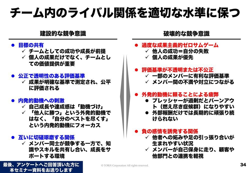 ただ、これが破壊的な競争意識になると、なんかギスギスした職場になってしまうということです。いつまで経っても他人と比べられて、「他の人にノウハウを教えると自分が損するんじゃないか?」みたいな状態は、内的な意味ではプラスの影響になりにくいですよね。