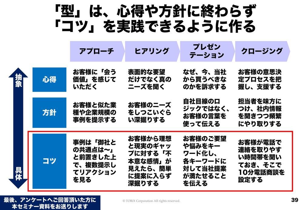 例えば「お客さまに会う価値を感じていただくような営業になりなさい」と言っても、「おっしゃることはごもっともです。私もそうなりたいです。でも、どうしたらいいんですか?」となるわけじゃないですか。