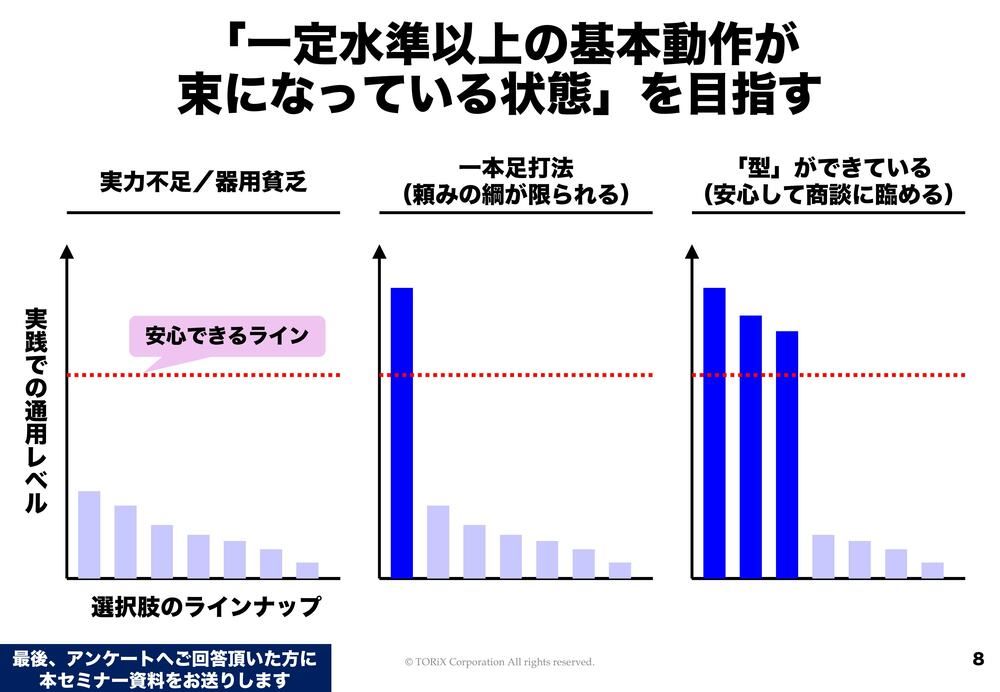 さっき「型が束になっている状態を作りましょう」ということをお話ししました。束になるためにはどうしたらいいかということなんですが、ある程度の基準を引き上げていきます。