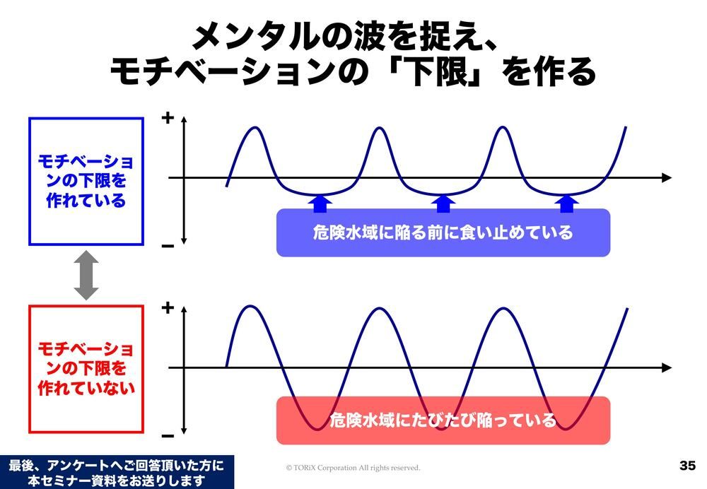 「モチベーションの下限を作る」というのは、人ですからモチベーションの上下は当然あるわけですし、私にもあります。ただし“危険水域”に陥る前に食い止めることができず、危険水域に度々陥ると、どこかで心が折れてしまいやすいんです。