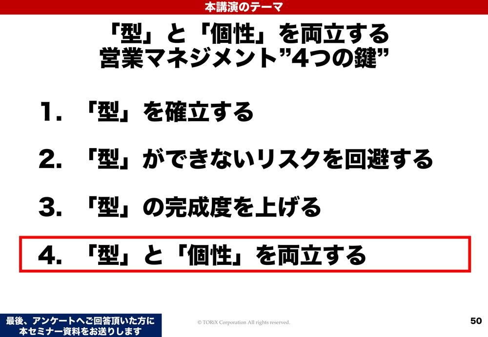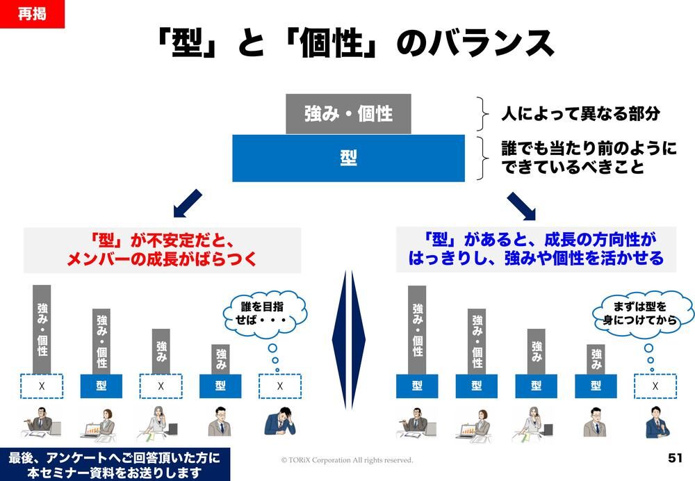 もう1回、このスライドを出しましょうかね。型も個性も両方が必要だということなんですが、型の話を前半でしてまいりました。