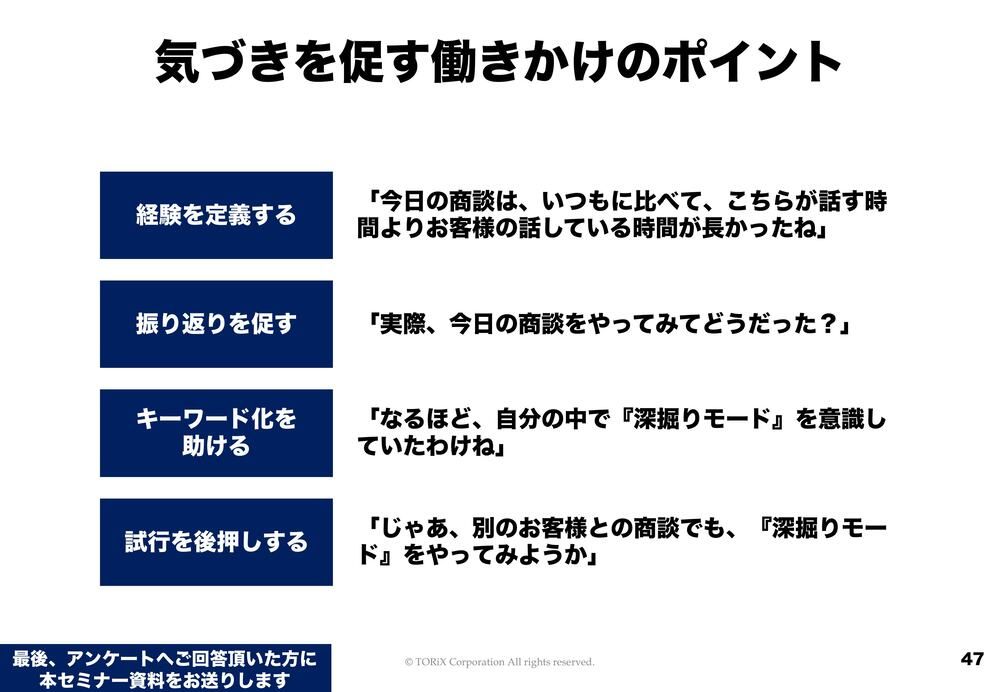 ちょっと想像いただきたいんですが、街中の店舗に飛び込むといっても、例えば喫茶店、ケーキ屋さん、コンビニエンスストア、オフィスとかいろいろありますよね。そうなった時に、ハイパフォーマーの方は自己紹介やオープニングトークをちょっと変えるわけですが、ローパフォーマーの方は本当に同じセリフばっかりでした。