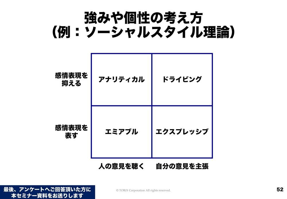 次に個性の話に入っていくと、個性と言ってもいろいろあります。例えば有名なもので言うと「ソーシャルスタイル理論」というものがあって、感情表現を抑えるのか・表すのか、自分の意見を主張するのか・人の意見を聞くのか、という分類で4象限があります。これはどれが正解というわけじゃなくて、個性の問題なんですよね。