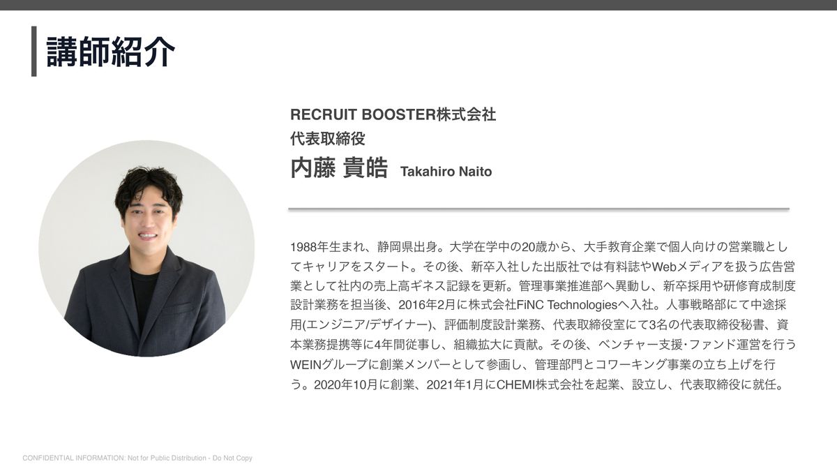 まず、講師紹介ということで、本日、講師・進行を務めさせていただきますRECRUIT BOOSTER代表取締役の内藤貴皓と申します。