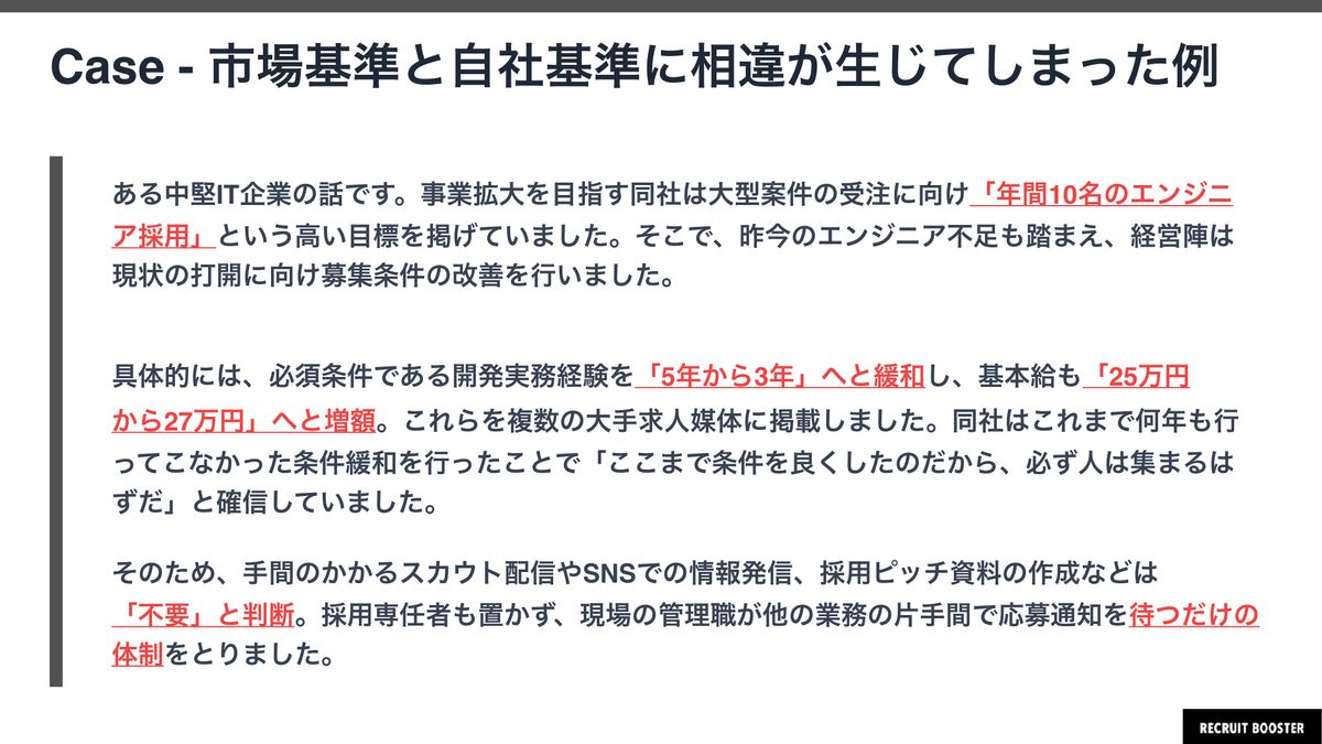 市場基準と自社基準に相違が生じてしまった例。ある中堅IT企業の話です。事業拡大を目指す同社は、大型案件の受注に向け、年間10名のエンジニア採用という高い目標を掲げていました。昨今エンジニア不足ということがすごく言われているので、この会社にとって年間10名は高い目標でした。