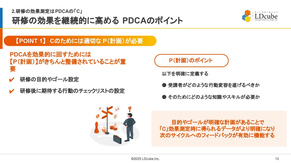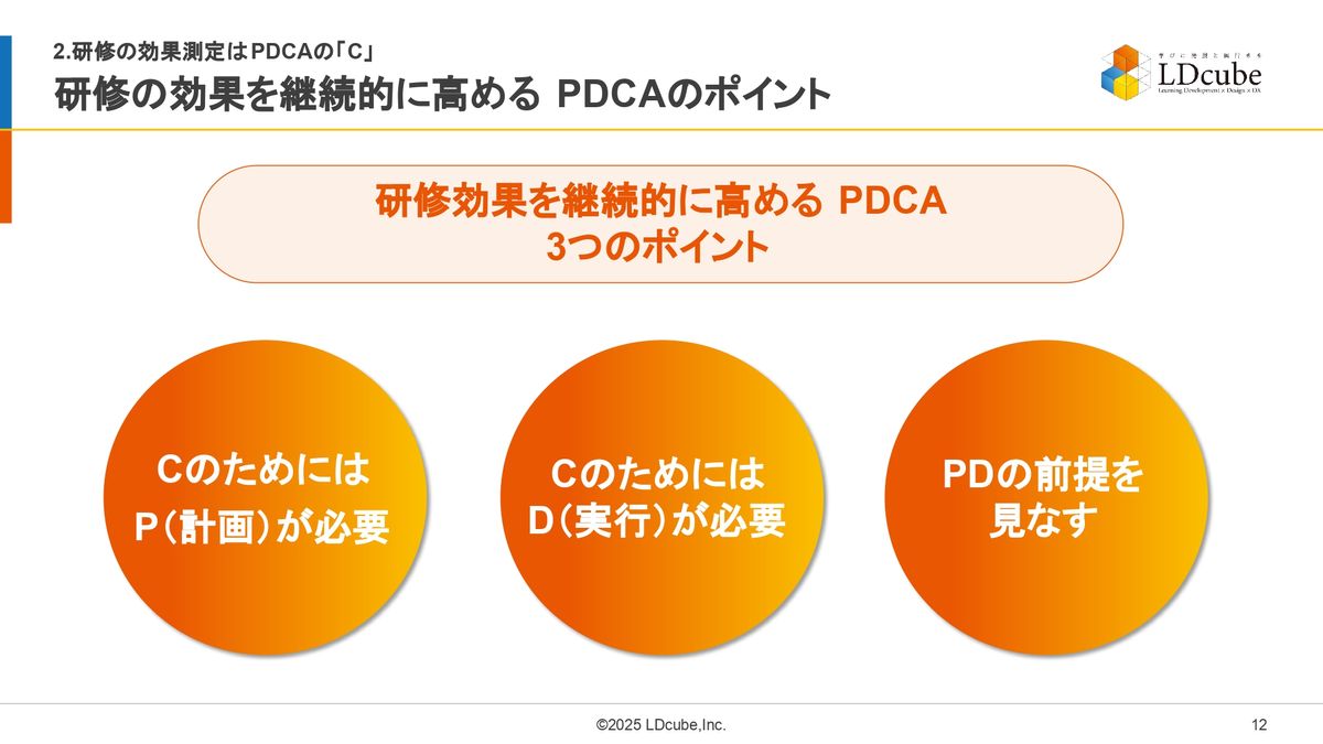 まずはポイント1。Checkのためには、適切な計画が必要だということです。PDCAを効果的に回すためには、計画(Plan)がきちんと整備されていることが重要です。ここでいう計画というのは、研修の目的やゴール設定というところです。
