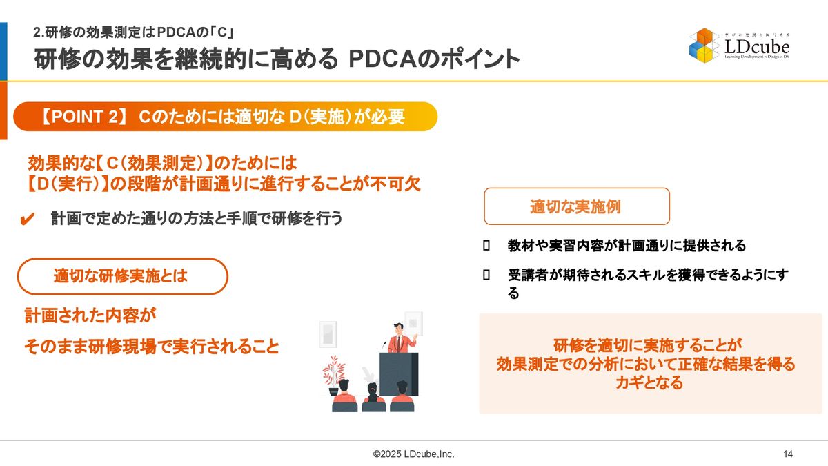 研修を適切に実施することが、効果測定での分析においては正確な結果を得るカギになります。だからこそ、Doのポイントが間違っていたとしたら「こういうやり方が良くなかったよな」「当日、こういうような教え方が、こういうような理解が得られなかったから、Checkをした時にうまく効果が現れなかったんだ」なんていうところがあります。